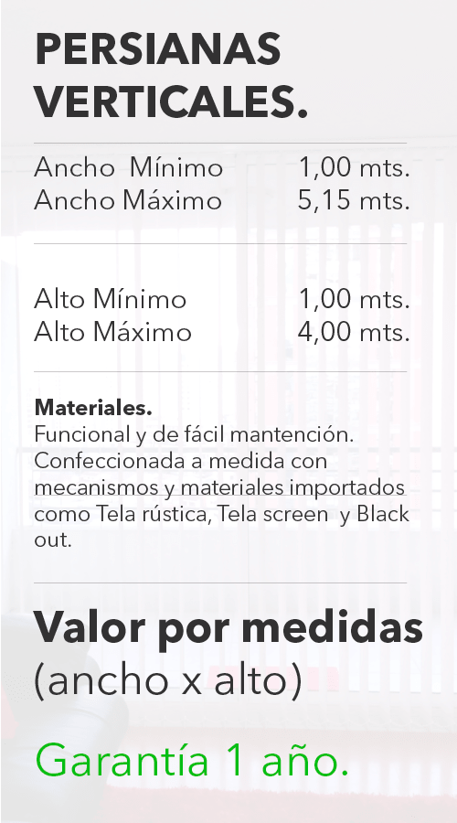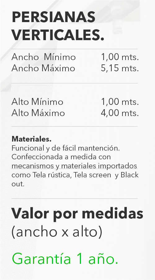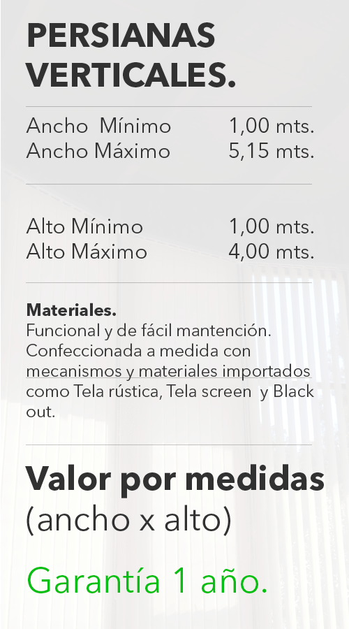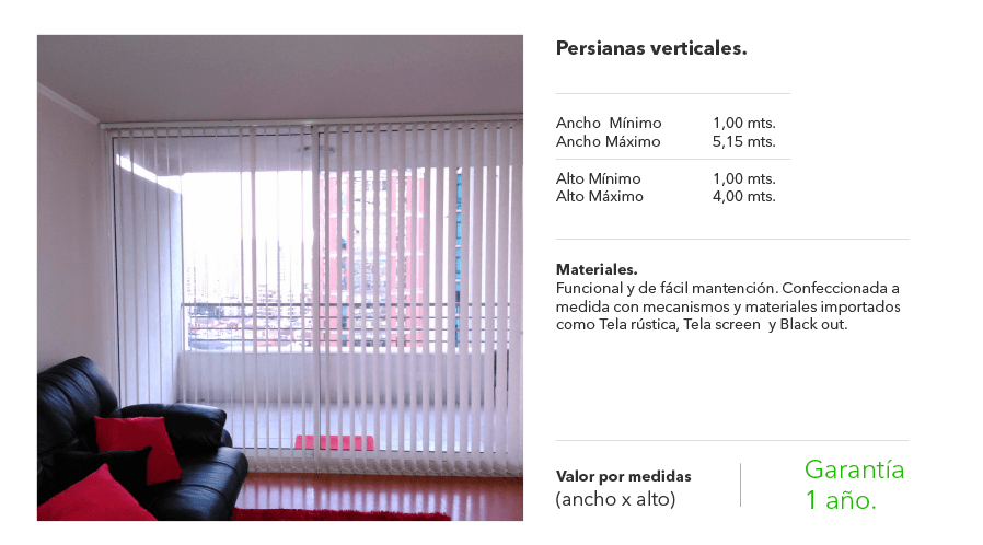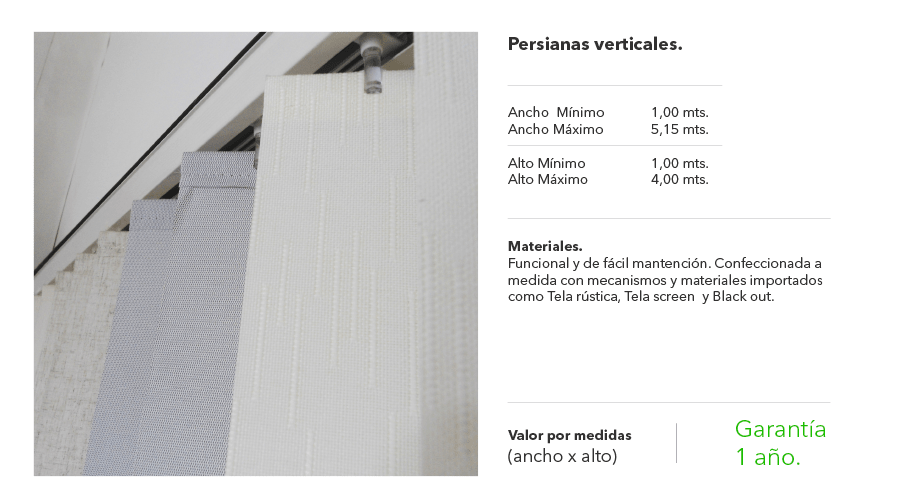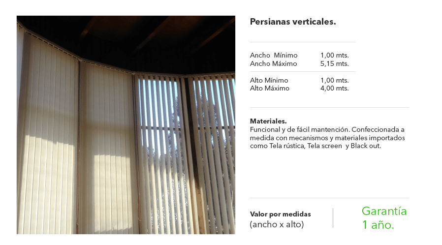 Funcional y de fácil mantención. Confeccionada a medida con mecanismos y materiales importados como Tela rústica, Tela screen y Black out.